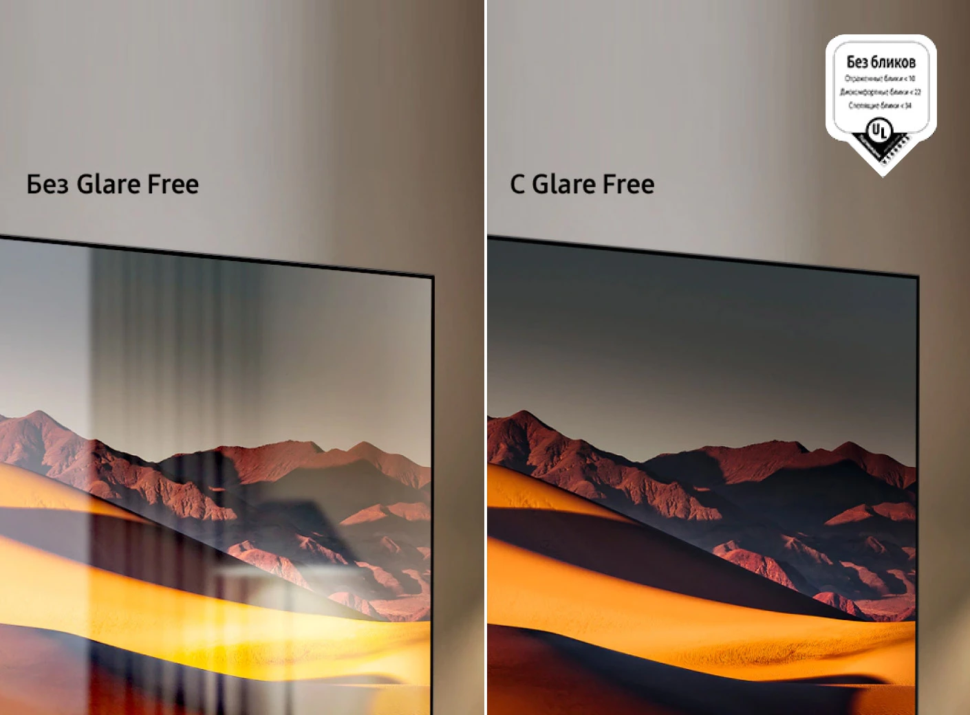 Еще одна особенность — антибликовая технология. На экран наносится специальный слой с низким коэффициентом отражения, который рассеивает свет и не отражает его обратно. Благодаря этому появилась возможность смотреть кино днем без тусклых цветов и ночью без потери деталей в темных сценах независимо от освещения в комнате.