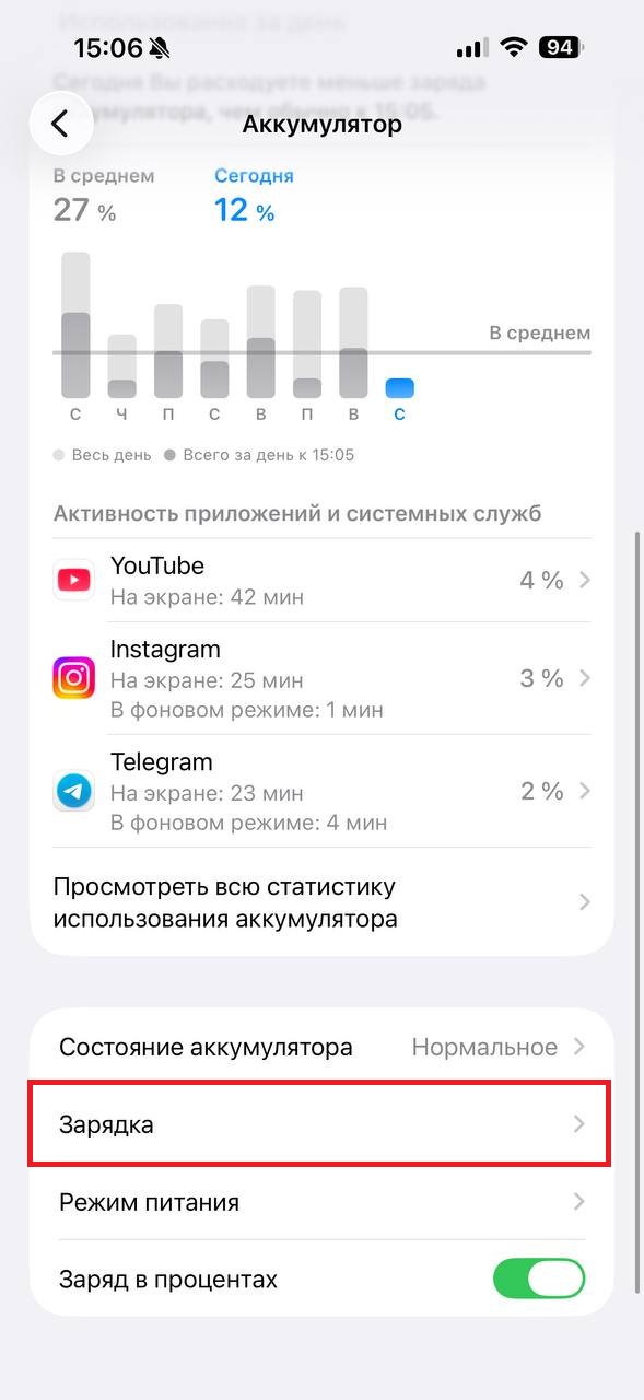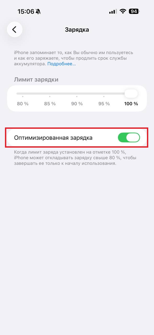 Если вы хотите не только сэкономить ресурс батареи, но и замедлить ее износ, стоит включить оптимизированную зарядку. Эта функция помогает iPhone заряжаться более бережно: смартфон анализирует ваш привычный режим использования и сам решает, когда довести заряд до 100%, чтобы аккумулятор не находился долгое время полностью заряженным без необходимости.